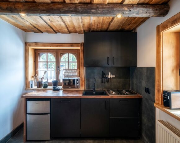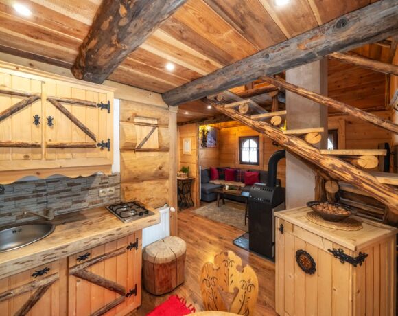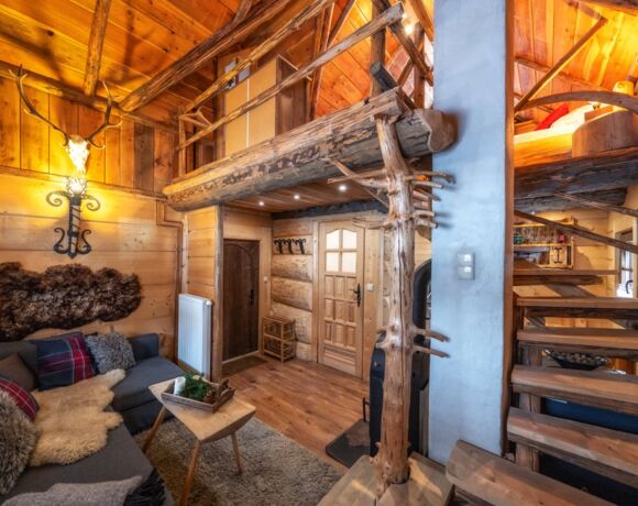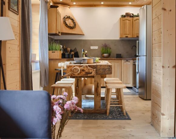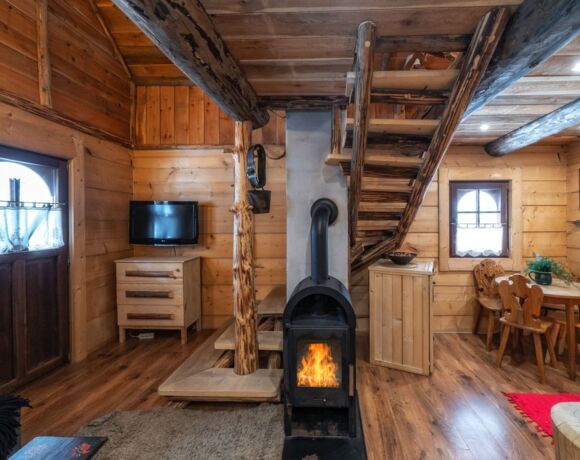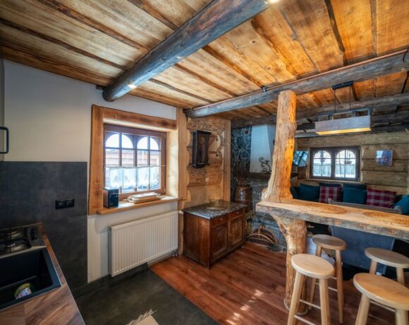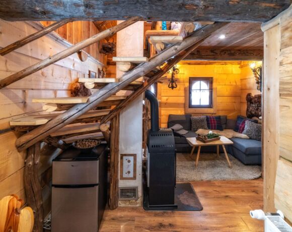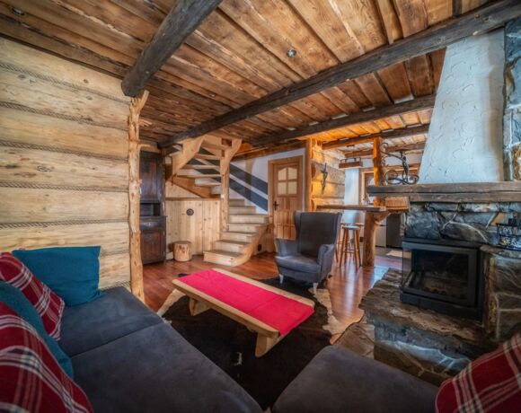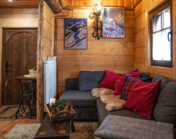 Domek o powierzchni 44 m², idealny dla 4 osób, łączy góralski styl z wygodą. Na antresoli mieści się sypialnia, a na parterze przytulny salon z rozkładaną sofą, piecykiem typu koza i aneksem kuchennym. Taras z huśtawką i grillem to idealne miejsce na relaks. Domek wyposażony w drewno do palenia zapewnia ciepło i wyjątkowy klimat.
